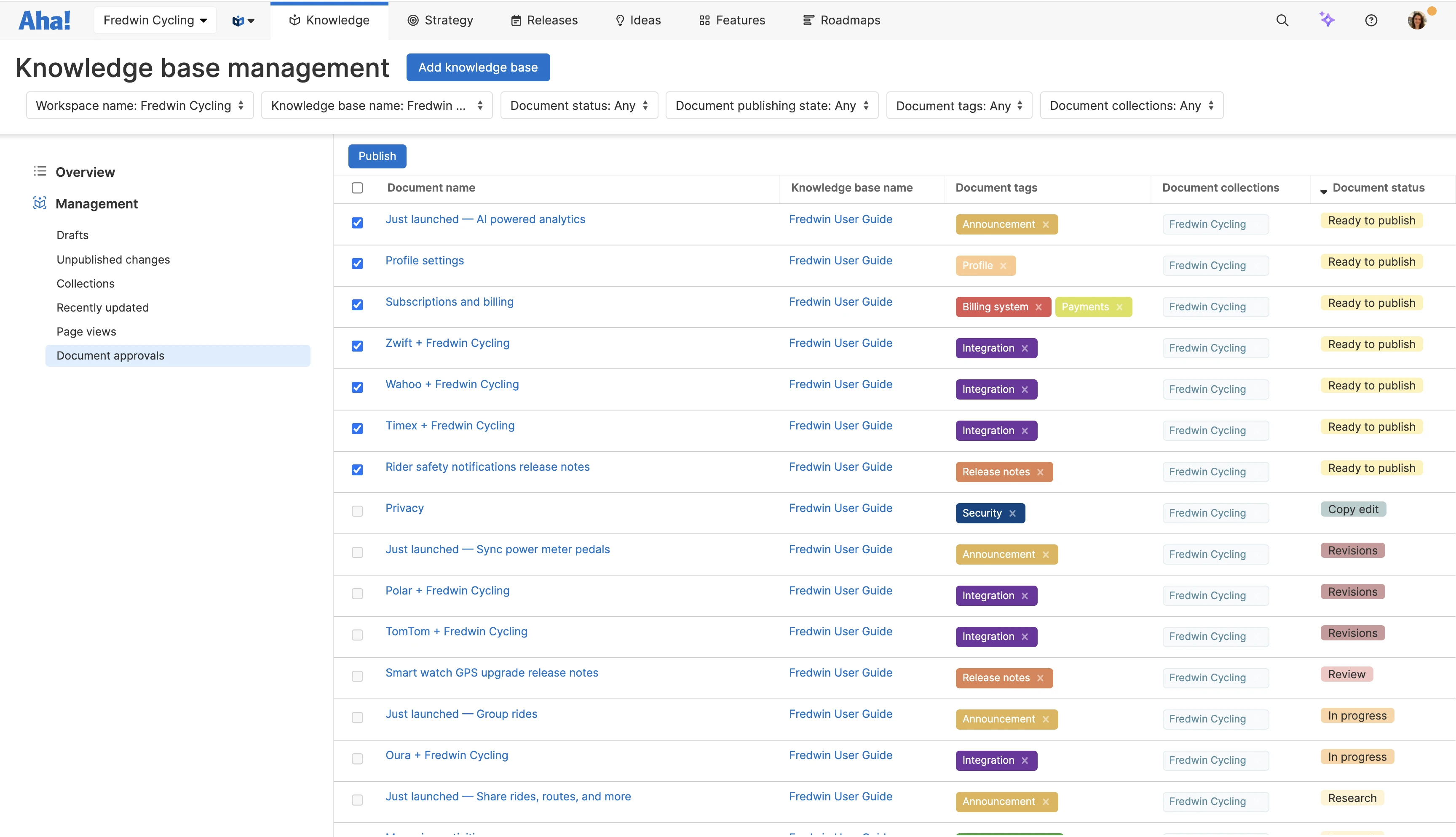Likewise, use the new Document approvals view to track the status of every article in one view and publish updates in bulk. Interested in learning more? Contact us to get a demo of Aha! Knowledge Advanced or upgrade your account.