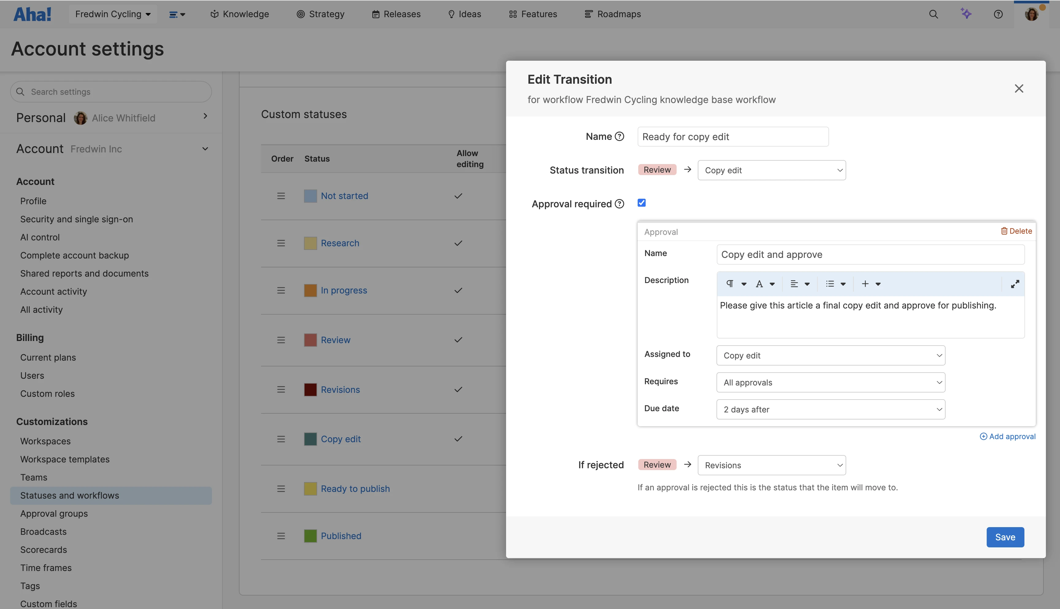 Set up custom workflows in Aha! Knowledge to manage document reviews — so only accurate, approved content is published.