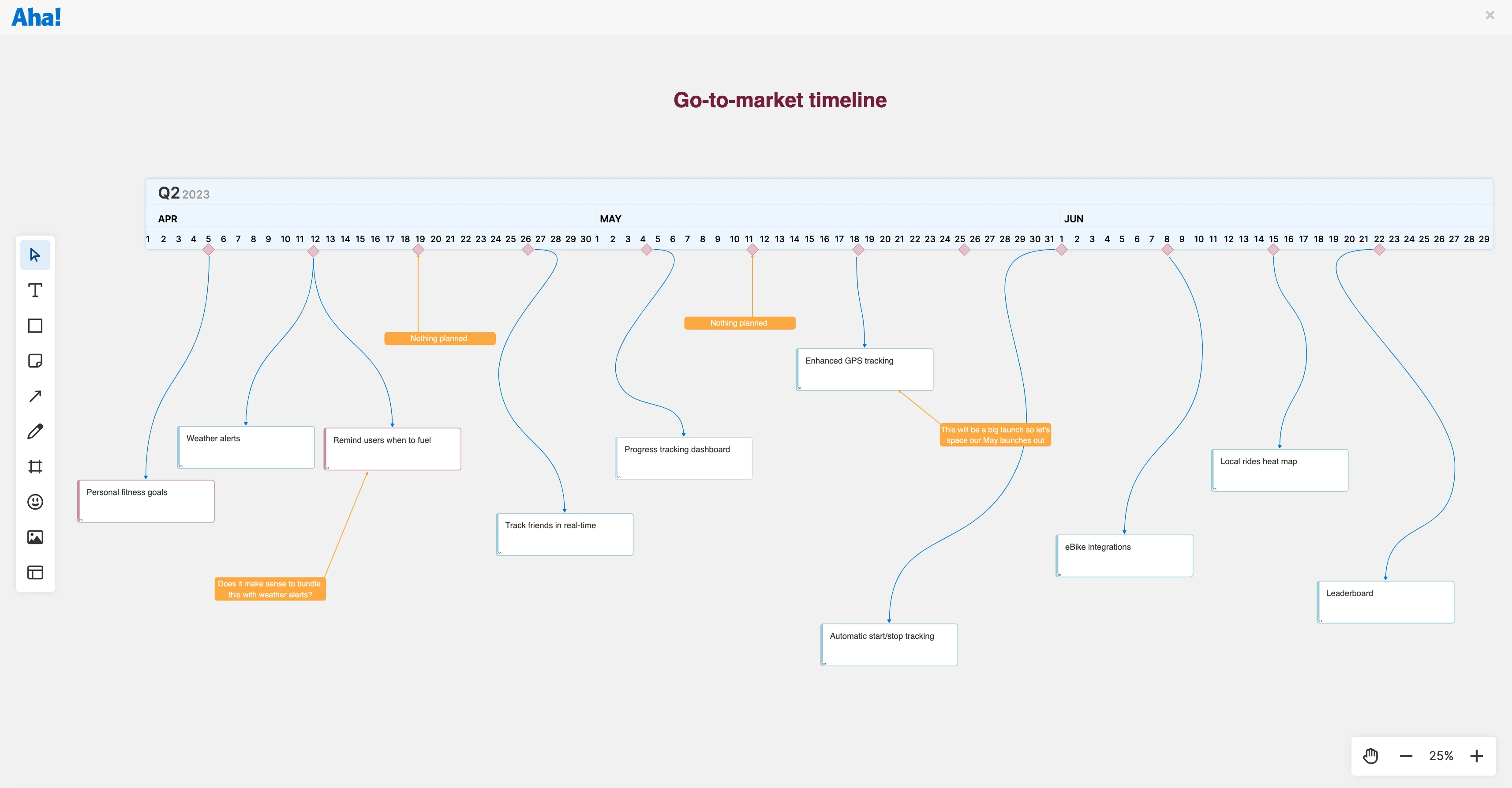 Add an adjustable timeline and progress bars to whiteboards in Aha! software to showcase the timing of your plans.