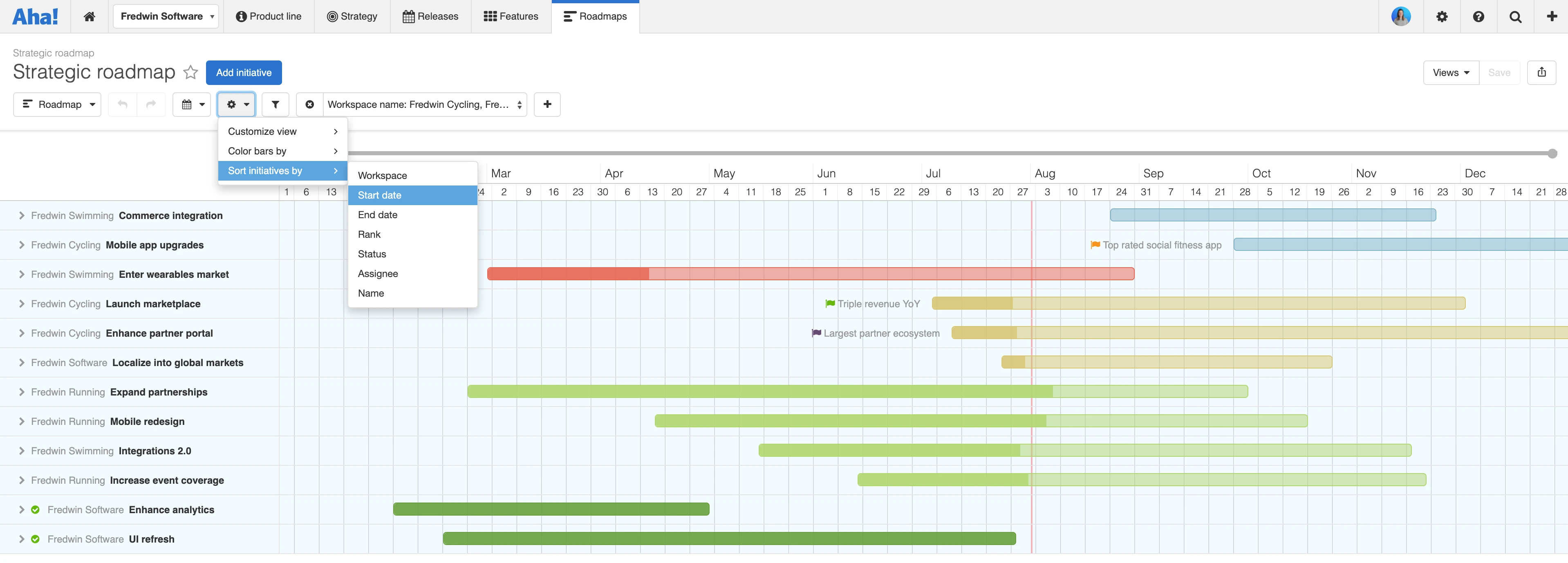 Visualize initiatives across multiple products in one view. Initiatives sorted by product are organized based on your workspace hierarchy — first by parent line and then by workspace. In the example below, we included initiatives from the Fredwin Software product line and three products within it, then sorted by workspace. Coloring the initiative bars by assignee makes it even easier to visualize our strategic plans across the portfolio.