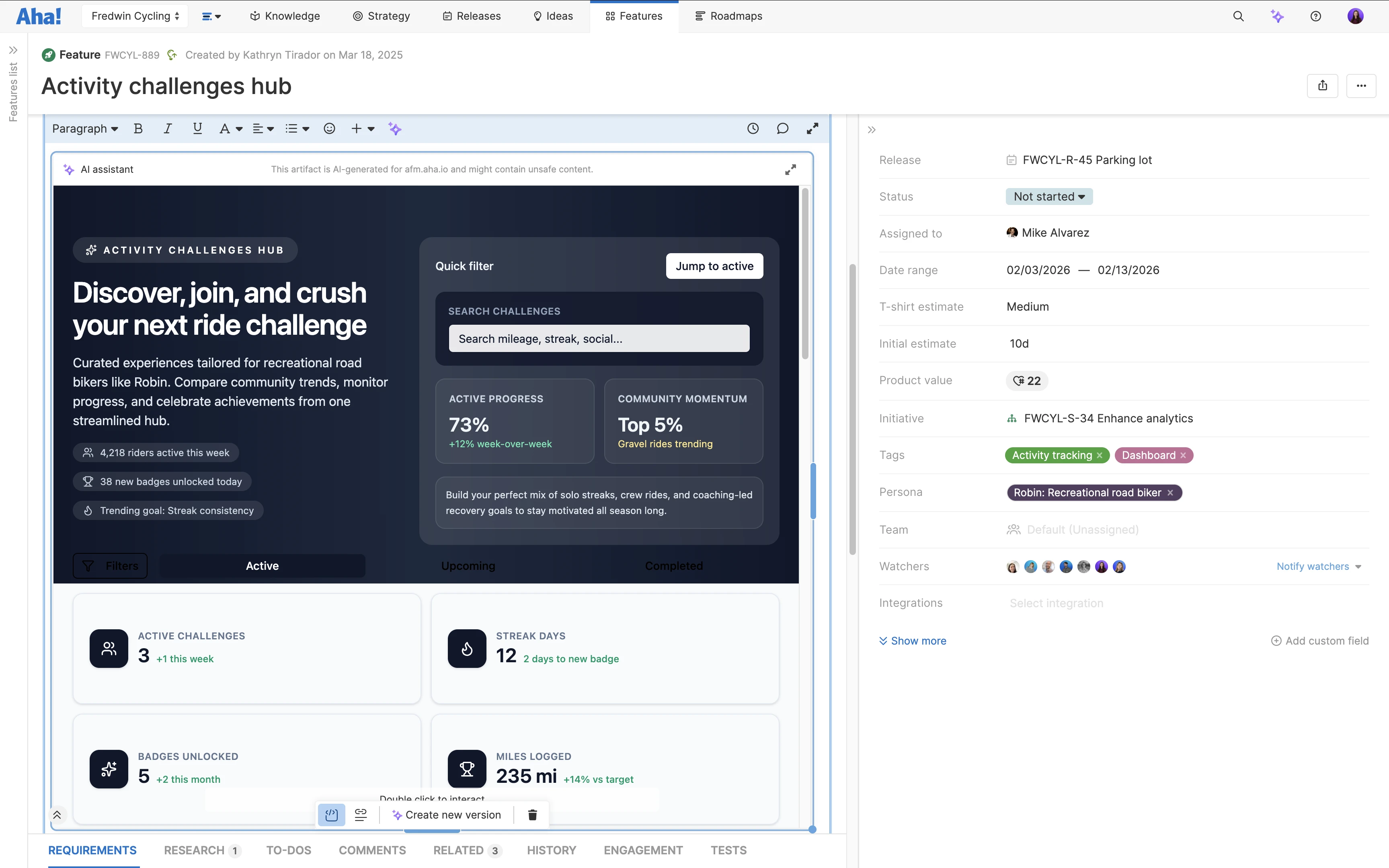 The AI assistant is available to all Aha! customers. Our suite of product development tools works seamlessly together to help teams turn raw concepts into valuable new capabilities — for customers and the business. Set strategy, crowdsource ideas, spark creativity, prioritize features, share roadmaps, manage releases, and plan development. Sign up for a free 30-day trial or join a live demo to see why more than 1 million product builders trust our software to build lovable products and be happy doing it.