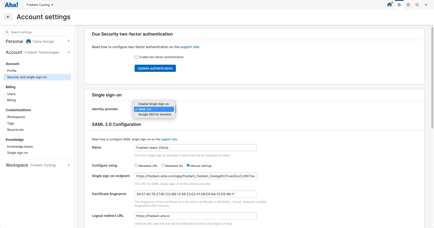 Aha! software billing administrators can still manage specific user permissions in their account settings when SSO is enabled.