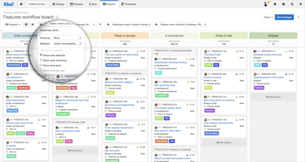 Visualize work by status Choose what type of record you want to display, then refine your view. You can apply filters (such as users, workspace, and release name), choose which workflow statuses are visible, and customize card layout and capacity planning information. Here, we are showing features from multiple releases without swimlanes so we can see everything assigned to the team.