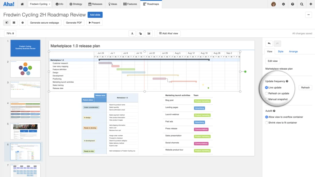 Choose how embedded views on slides are updated You can include multiple Aha! views on the same slide and control how each one is updated. Choose between a live view, refresh on update, or a snapshot in time. Many teams prefer the live view, so your presentation is always current. No more worrying about version control or wasting hours updating slides when plans change.