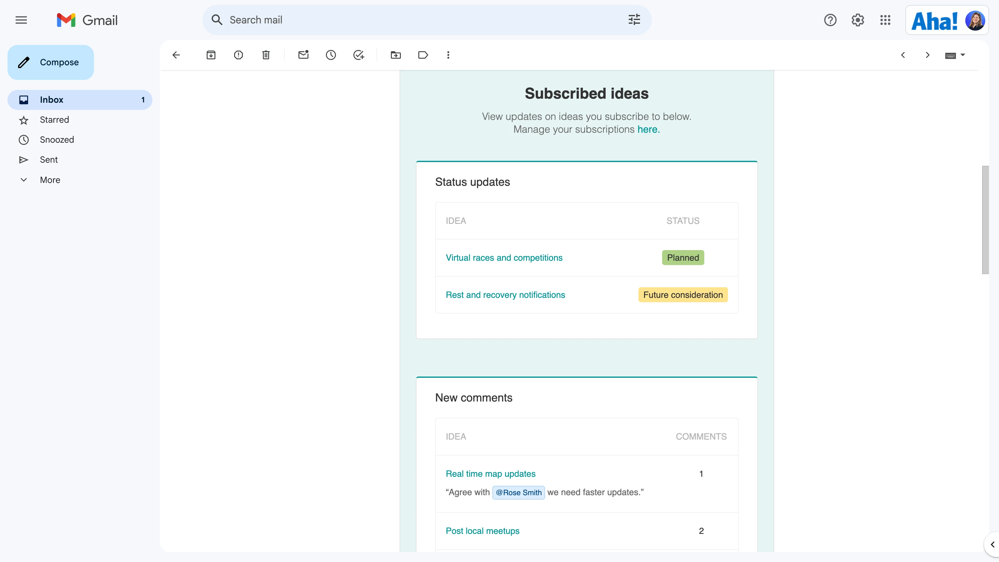 If you use the Aha! ideas portal to share feedback with us, you already receive this updated weekly summary email. Thank you for your valuable input!