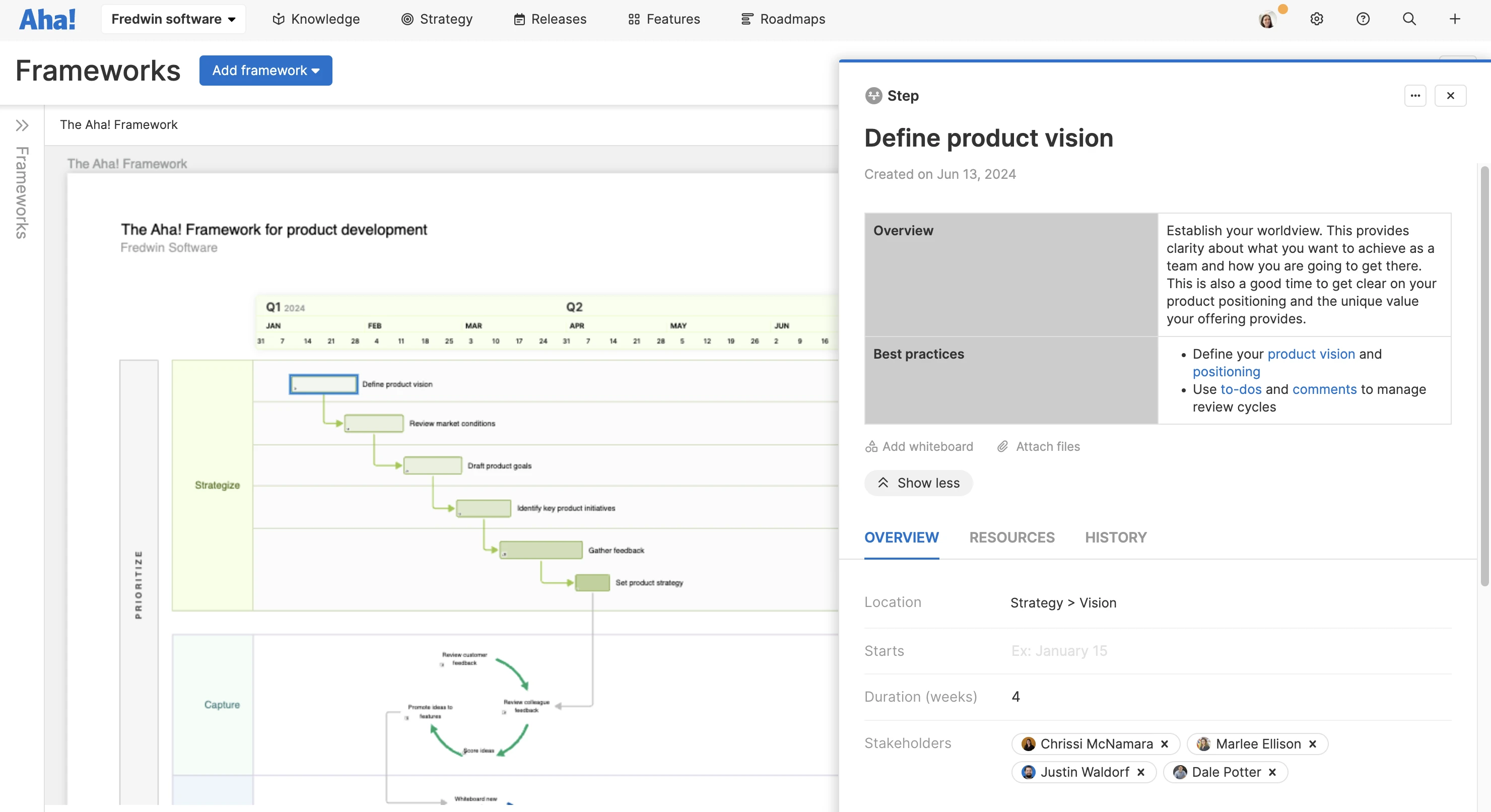 Help everyone understand how work gets done. Create a framework to define and diagram your approach — providing an overview, best practices, and links to key views to clarify exactly what happens and where in each step. (Here, we used The Aha! Framework template to explain our strategic approach to agile development.) Making this your default homepage provides organizational clarity and drives consistency.