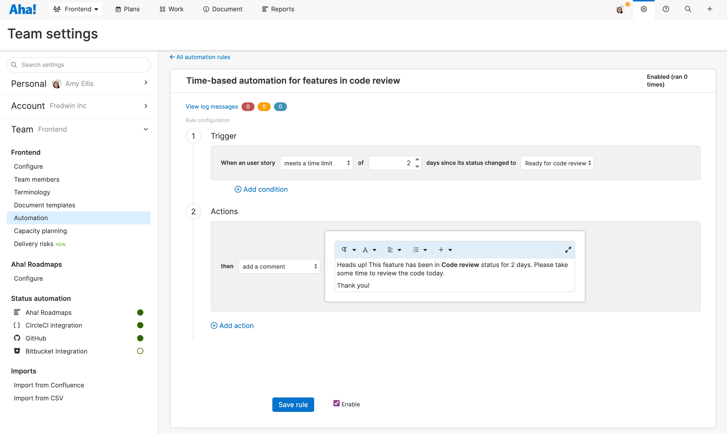 Move features through code review quickly in Aha! Develop. Below, we already have a rule in place to automatically assign a feature when it is ready for review. We created a second rule to add a comment if the feature stays in Code review for more than two days. This brings a sense of urgency to the process — so we can deliver value to customers, faster.