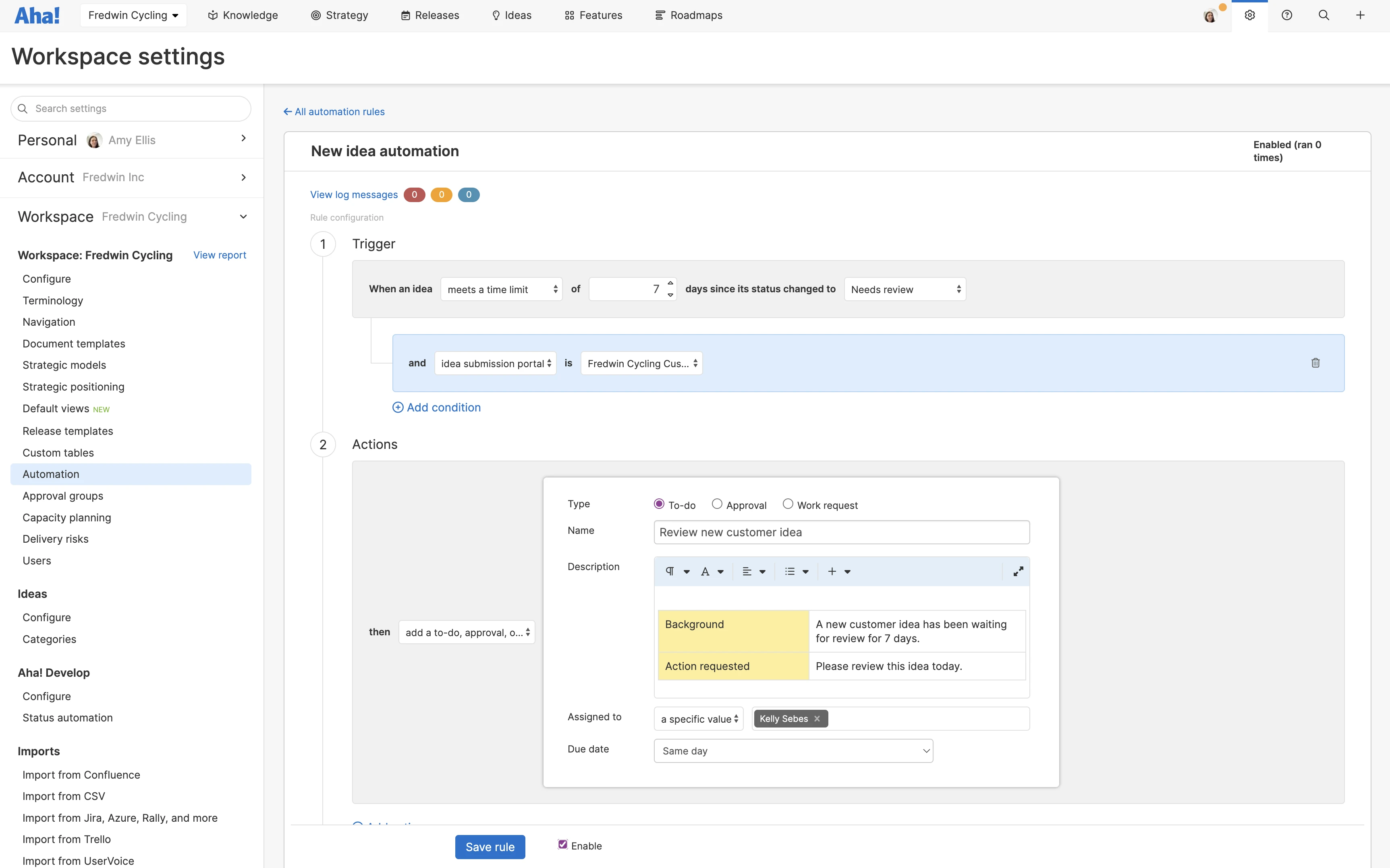 Stay on top of customer feedback in Aha! Ideas. Here, we used automation to set a time limit for reviewing new ideas. If an idea is still in Needs review status after seven days, a to-do will automatically be assigned to the right product manager that reminds them to take action. This is helpful if you have an internal service-level agreement about responding to new ideas or simply want to manage customer feedback in an efficient, responsive way.