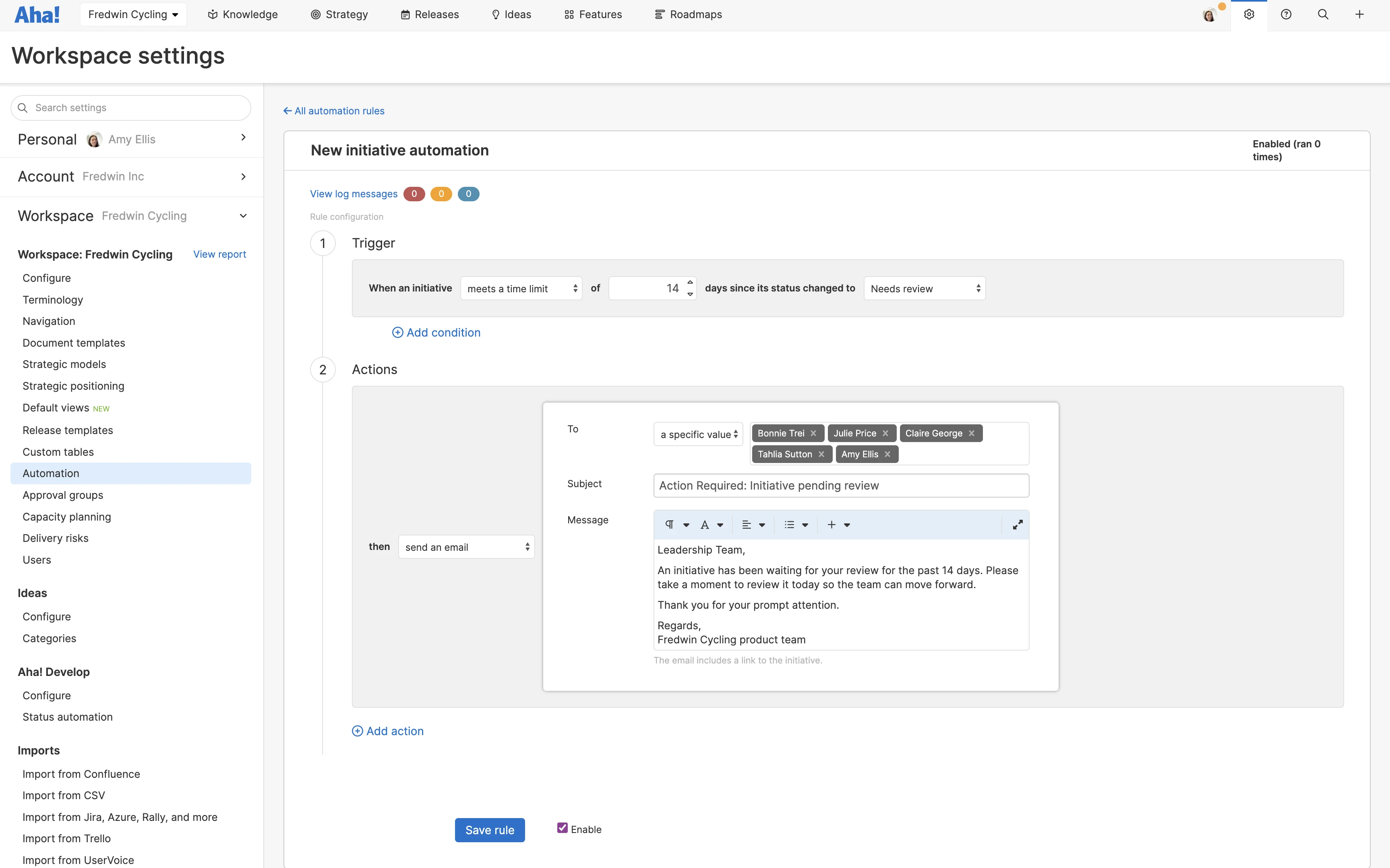Keep approvals moving smoothly in Aha! Roadmaps. Many teams use initiatives to evaluate investment decisions. In the example below, we set up an automation rule to send an email to the leadership team if an initiative is in Needs review status for more than 14 days. This helps the organization respond in a timely way to new business opportunities.