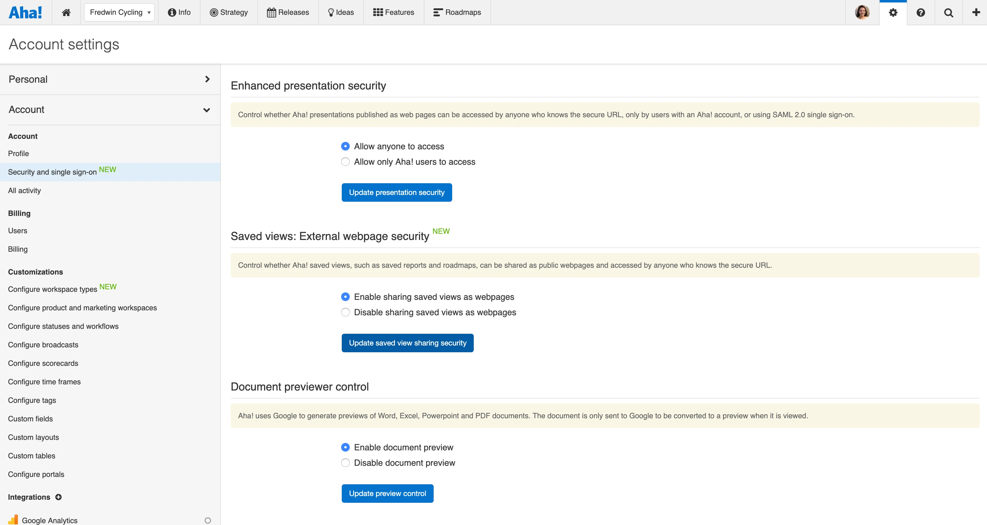 If you are already an Aha! user, then your account administrator will need to enable this option in the security and single sign-on section of the account settings. For new customers, the ability to share saved views as a webpage is the default setting.