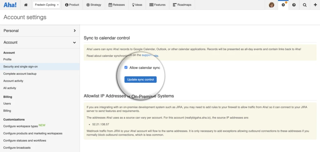 Update your account settings For new customers, the ability to sync Aha! records with a calendar application is the default setting. Existing customers will need to enable this option in the security and single sign-on section of the account settings. Administrators can enable or disable the setting at any time.