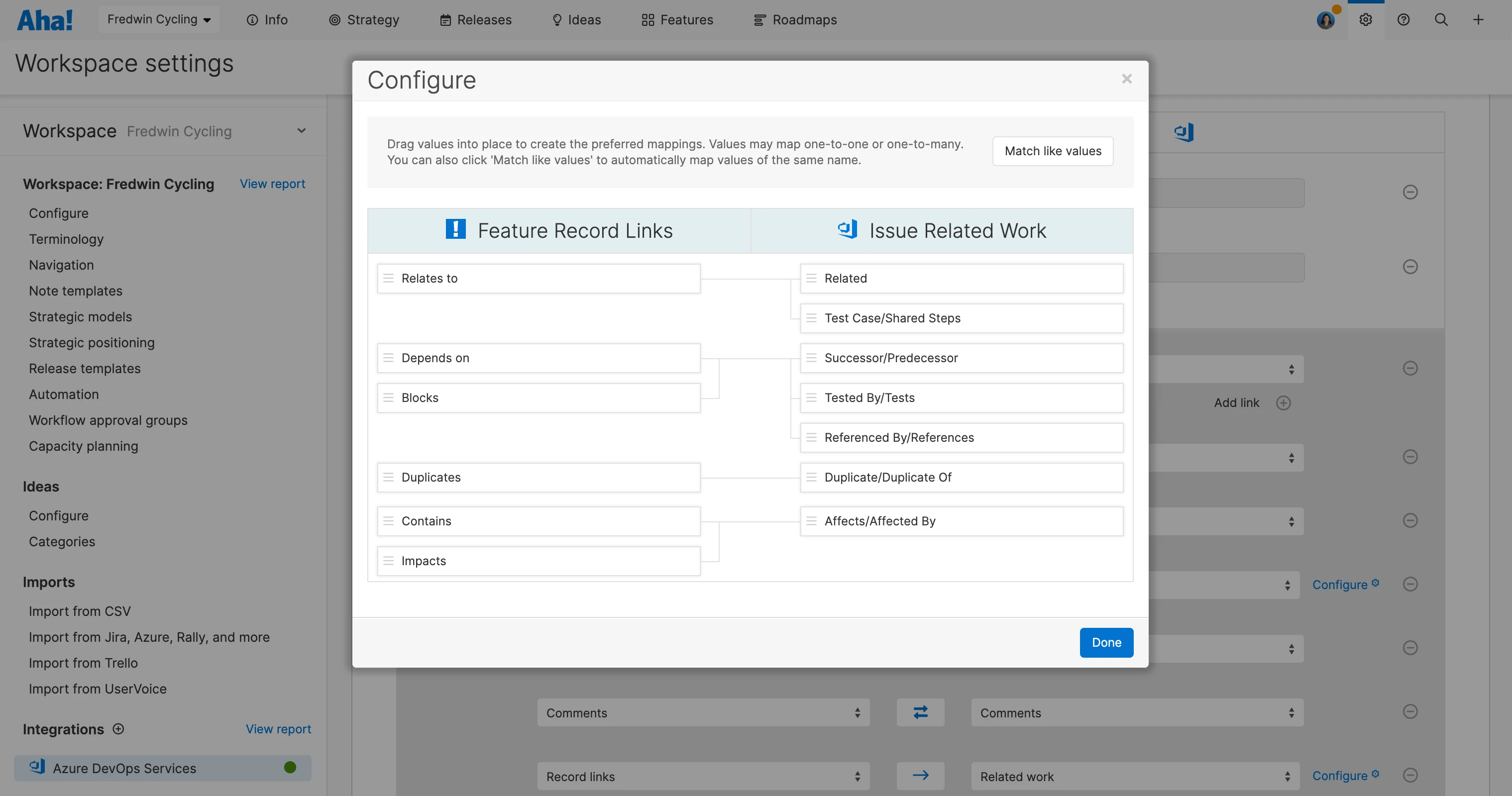 The new enhancement builds on our existing integration between Aha! Roadmaps and Azure DevOps. You were already able to sync initiatives, releases, epics, features, and requirements across both systems. Now you can automatically establish connections between dependencies by mapping related records across the tools.