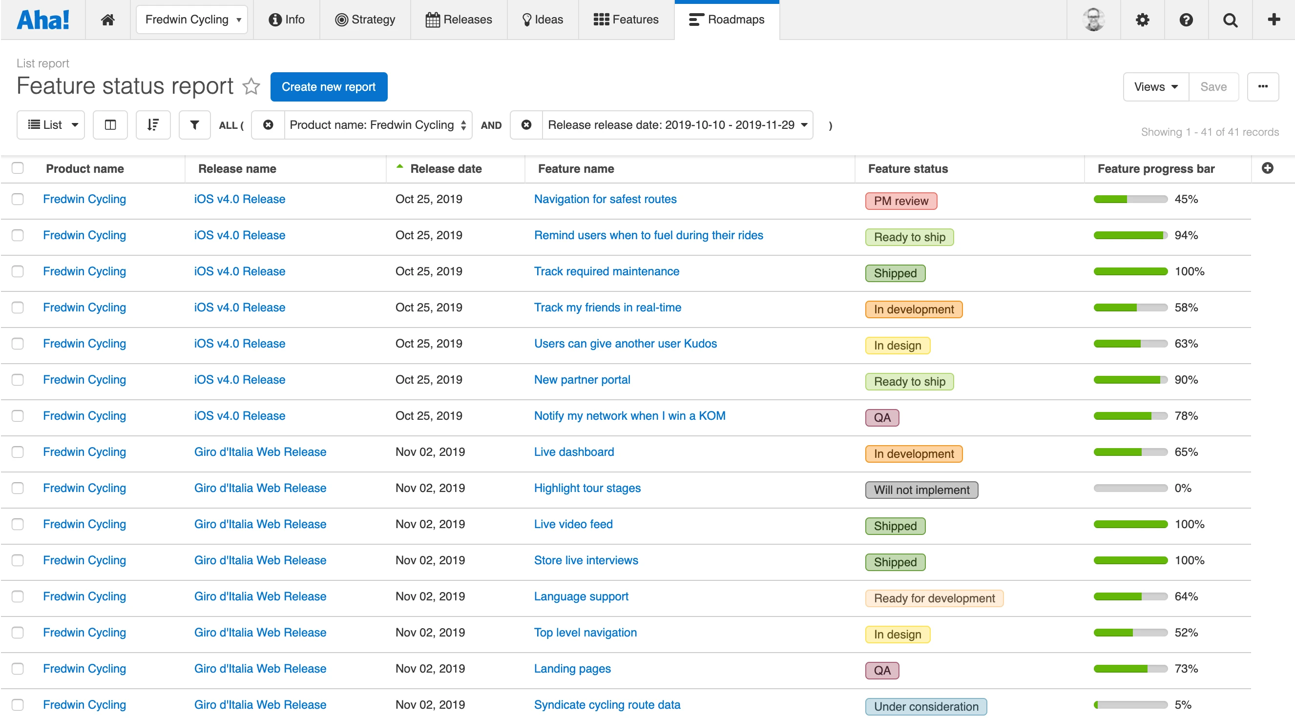 Visualize progress on reports and roadmaps Seeing that progress bar on an individual record is only the beginning. The at-a-glance view is even more powerful when you add the field to your list reports and pivot tables. This is helpful when you want to get a holistic view — such as the features status report shown below.