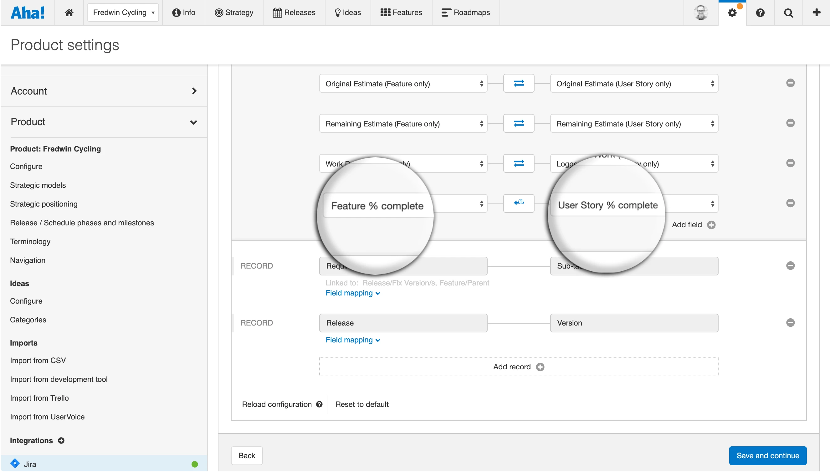 Map progress fields To get started, make sure the progress field is enabled in your Aha! product settings. You will then be able to set the integration mapping to sync the percent complete field from the development system with your Aha! records. In the example below, we are mapping the user story percent complete in Jira with the feature percent complete in Aha!