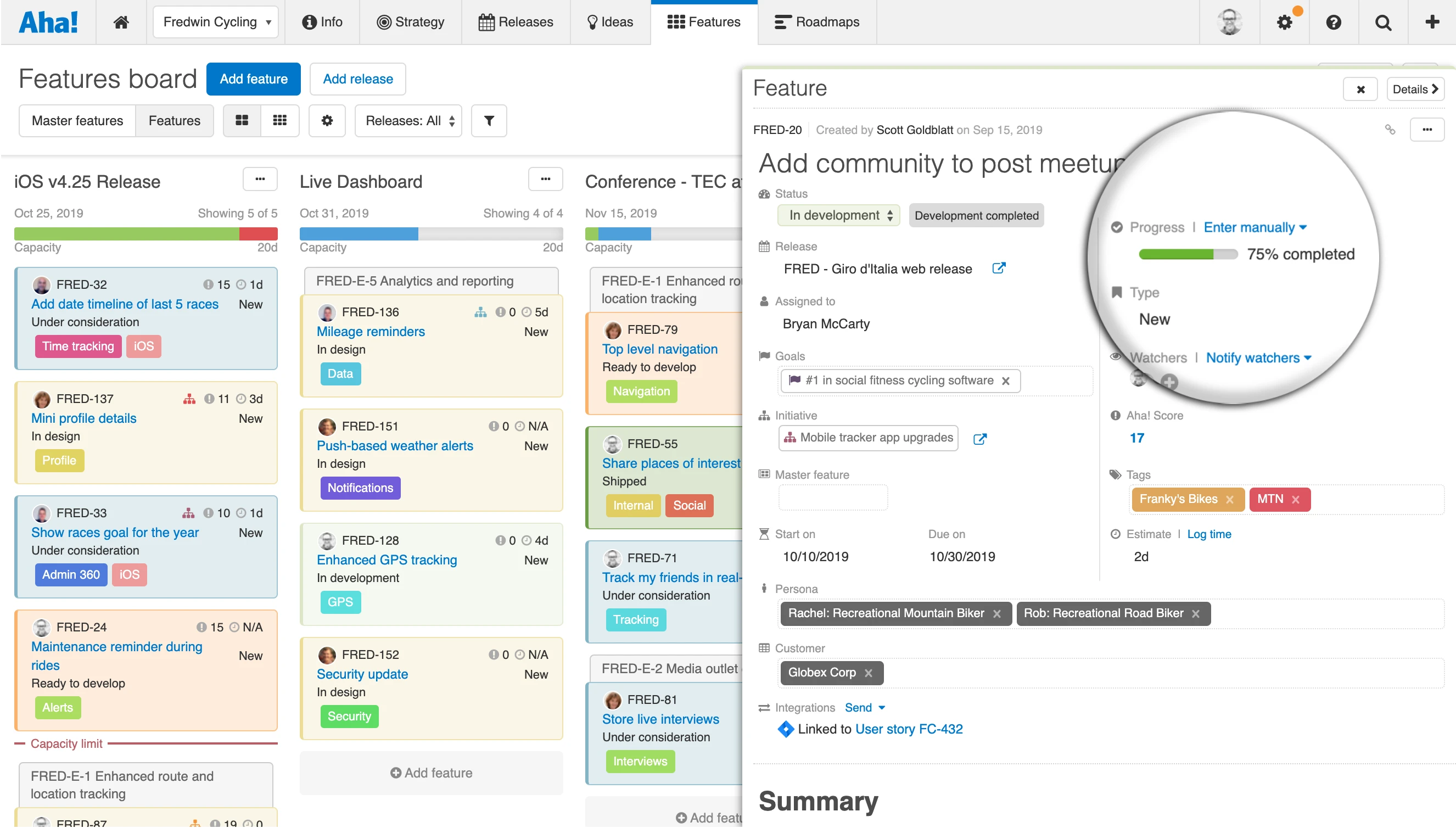 Track progress in Aha! Records in Aha! update automatically as the engineering team logs percent complete in their system. This means that you can instantly see if you are on track to meet the feature’s launch date. Open the drawer view to see more details. Below, we can see the feature is 75 percent complete based on the information syncing from the development system.