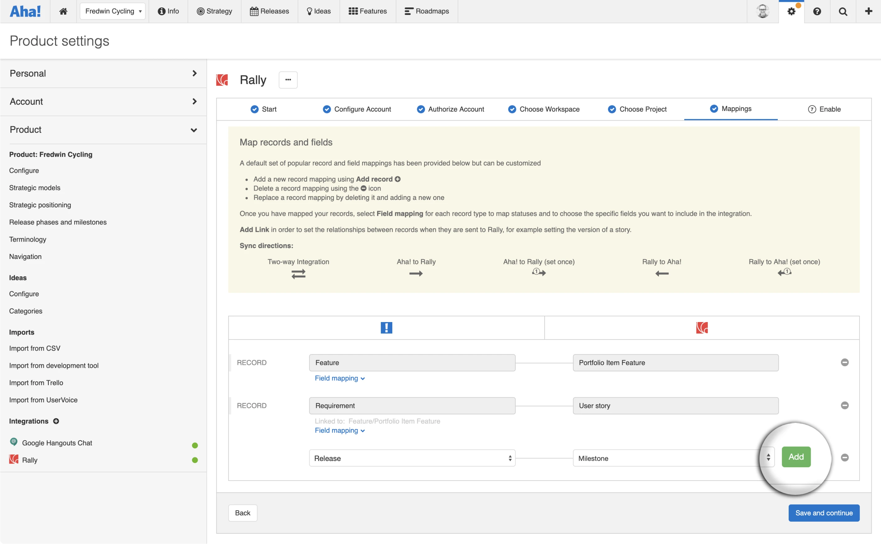 Map Aha! releases to Rally milestones Owners in Aha! product and marketing workspaces can add and configure integration settings. In the mappings step of the integration setup, add a new record mapping. Just set the mapping to sync Aha! releases to Rally milestones — so you always know that dates are correct in each system.