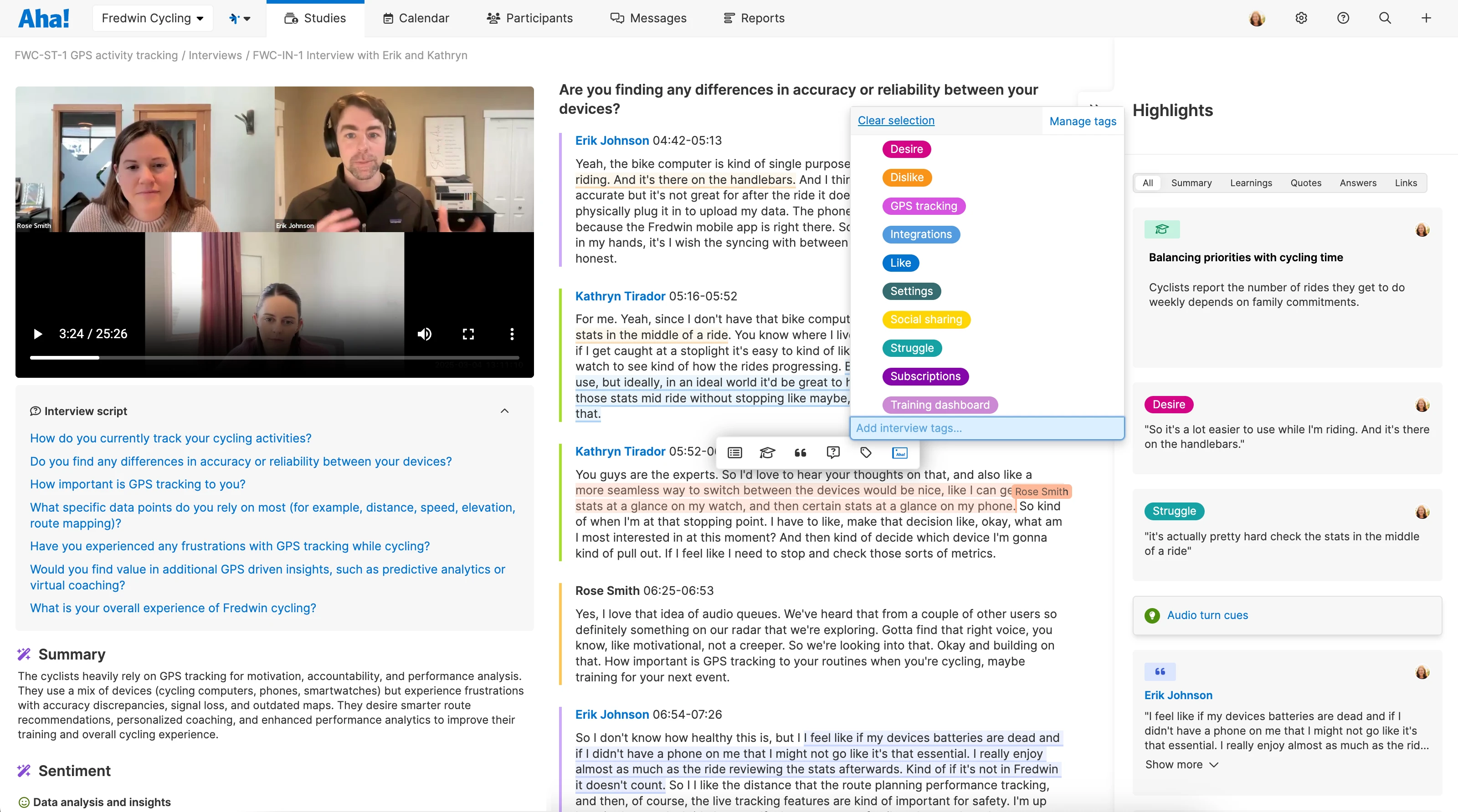 Set up the interview tags you want to use in your account settings. This makes it easy for the team to note important information in a consistent way. Below, we are reviewing a transcript from a recent interview with a Fredwin Cycling user (our fictitious cycling app). We tag feedback related to key areas of the application. This helps us quickly identify points of friction so we can improve the experience.