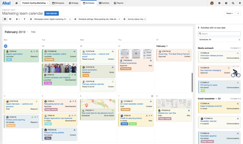 Marketing workspaces We launched a new purpose-built workspace for marketing teams in Aha! — so that product and marketing can work collaboratively to deliver products customers love. Several new features were in order too, including enhancements to creative briefs and calendar reports.