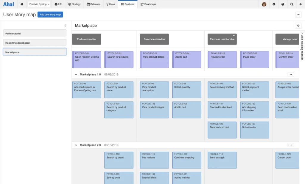 User story maps Many of you asked for a better way to align your roadmap with the customer journey. Viewing your product roadmap from a user’s perspective helps you focus on building what your customers really need. This year, we added user story maps in Aha! so you can do just that.