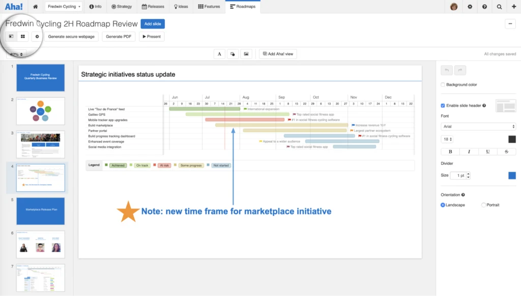 Whether you are celebrating your achievements or planning what is next, deliver brilliant presentations with the Aha! slide editor.