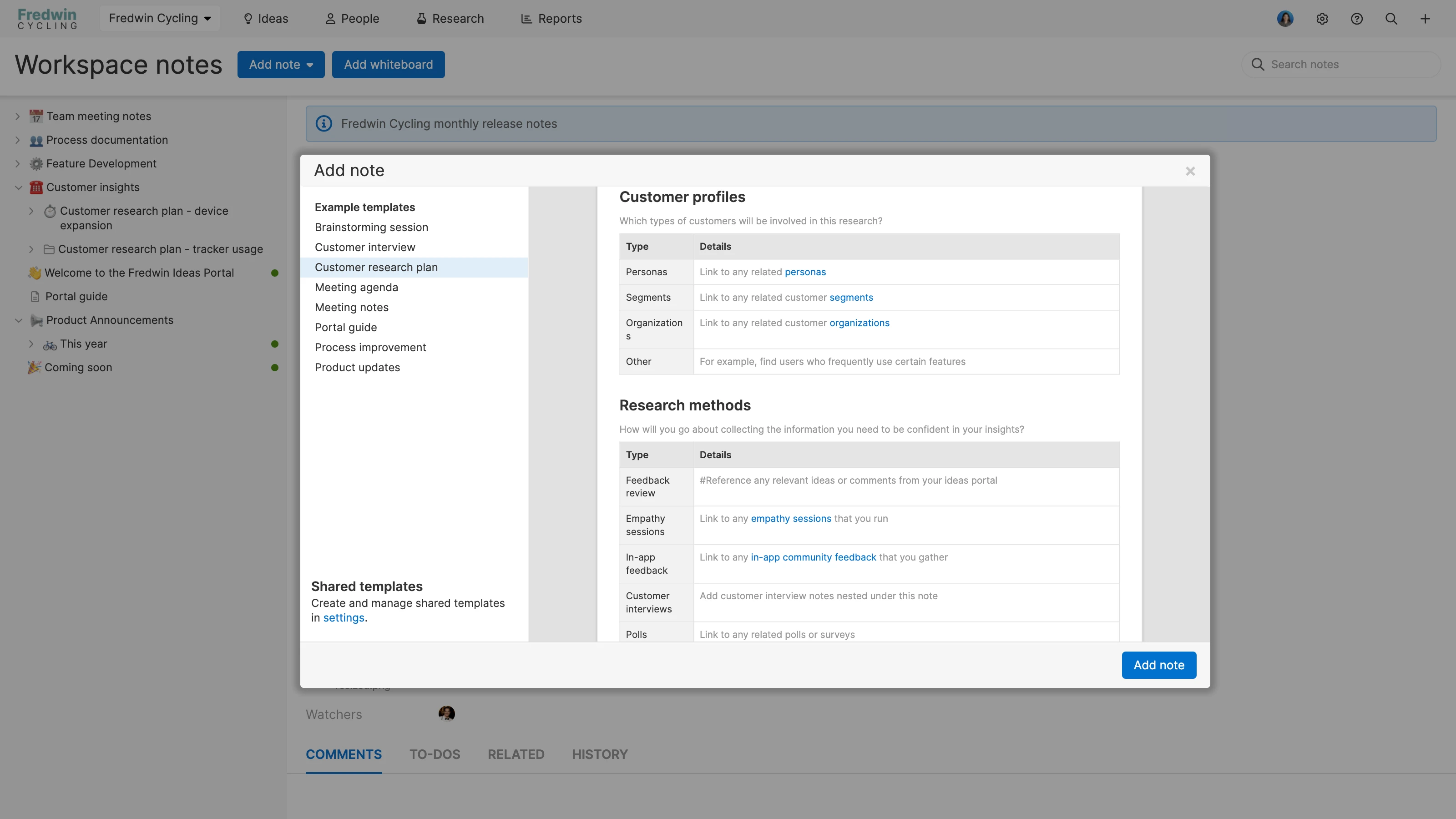 All Aha! Ideas users now have access to our powerful notes functionality. This gives you a central place to collaborate on and share team documents. As part of this update, we added three new note templates to help you plan customer research, document your feedback review process, and communicate product updates in a consistent way. Of course, you can also create your own templates using rich formatting options such as tables, images, and call-out boxes.