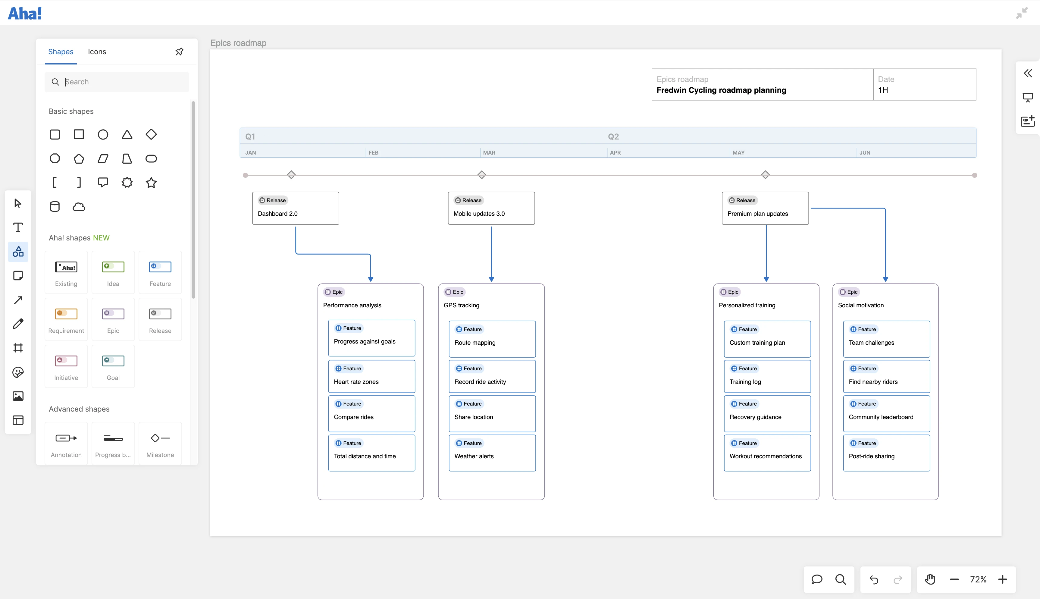 Use connectors or drag and drop shapes to create visual hierarchies that convert directly into Aha! records.