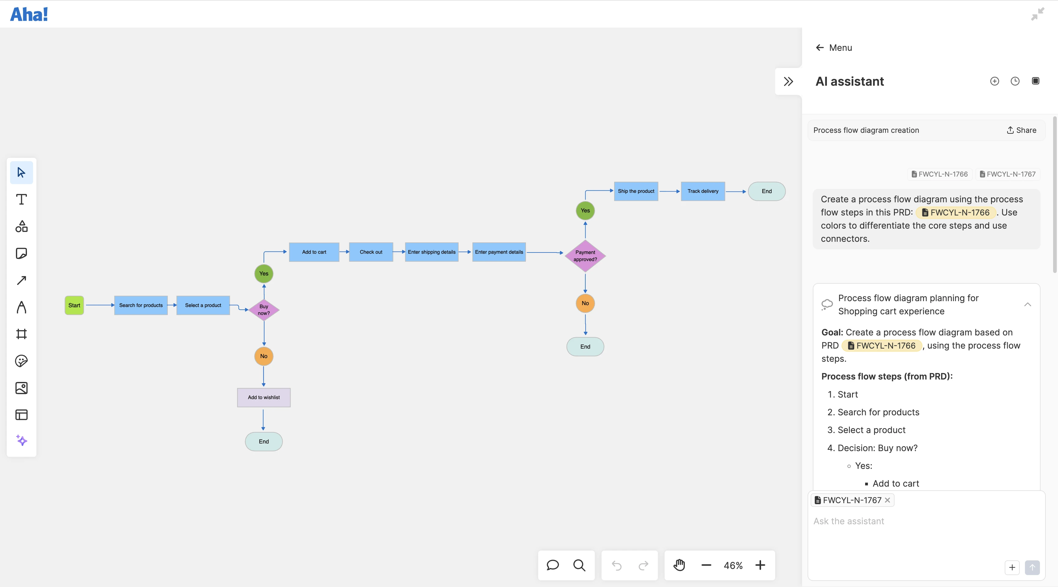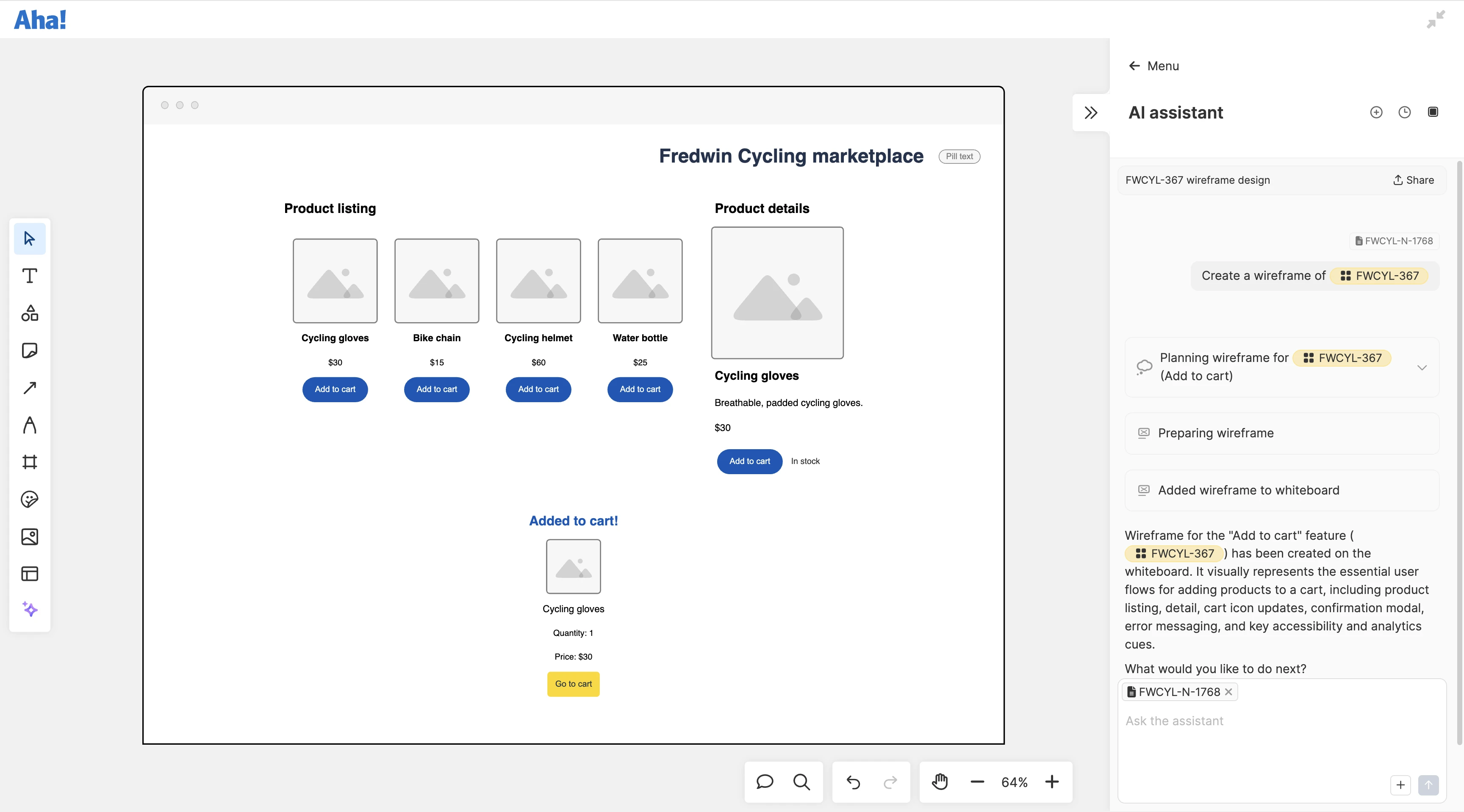 The AI assistant is now available to use in whiteboards for all Aha! customers. Our suite of tools includes Aha! Roadmaps, Aha! Discovery, Aha! Ideas, Aha! Whiteboards, Aha! Knowledge, Aha! Teamwork, and Aha! Develop. Use each product individually or combined to help teams deliver even greater value. Sign up for a free 30-day trial or join a live demo to see why more than 1 million product builders trust our software to build lovable products and be happy doing it.