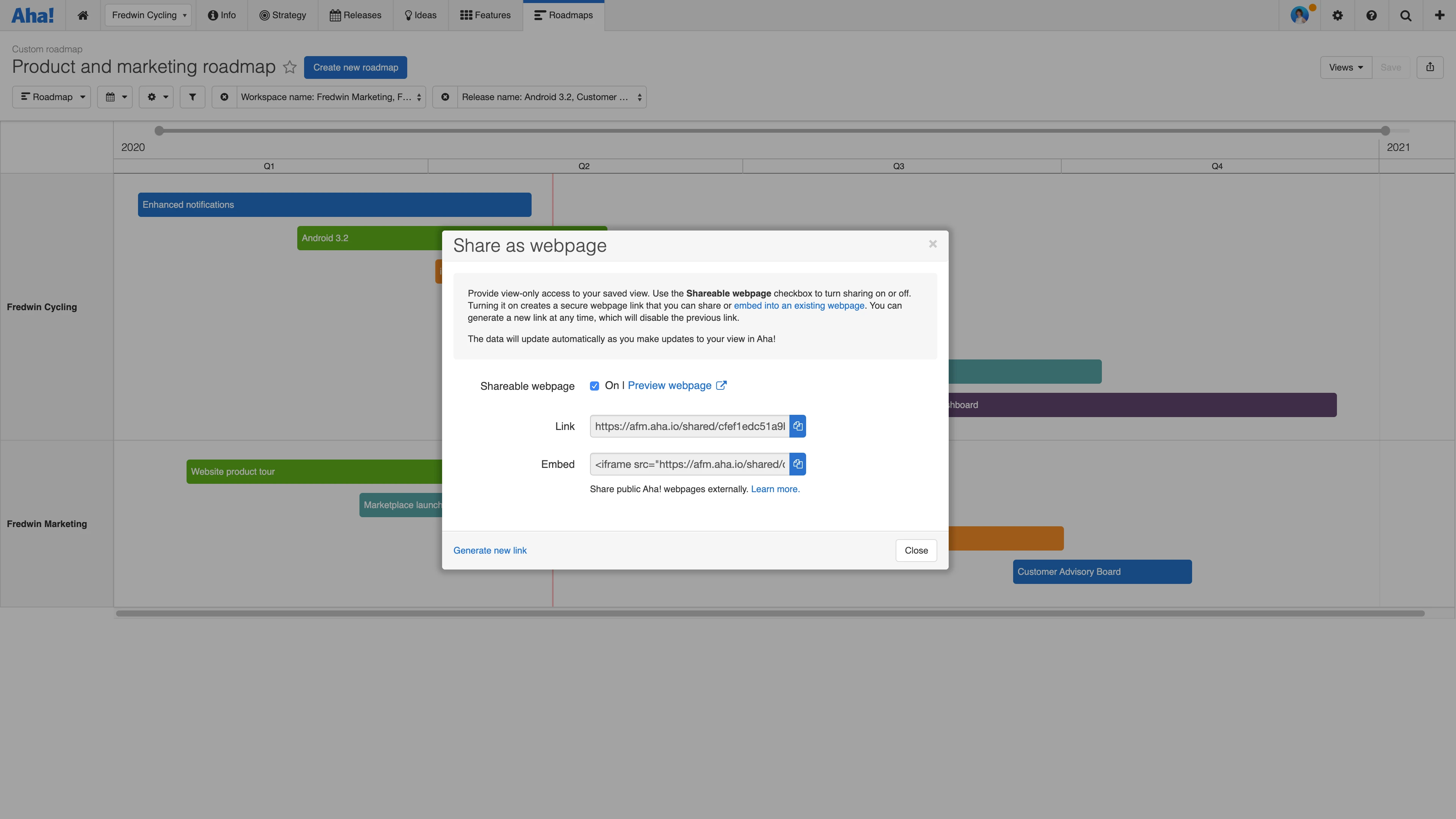 Start with any saved views of roadmaps or reports in your Aha! Roadmaps workspace. Generate a webpage link, copy it, then head to the Confluence page that you want to share and paste the link. This automatically activates the Aha! Roadmaps macro. Now, every embedded view in Confluence is live. This means that any updates made to your data in Aha! Roadmaps will automatically display in Confluence — so everyone sees the most up-to-date version of your product plans.