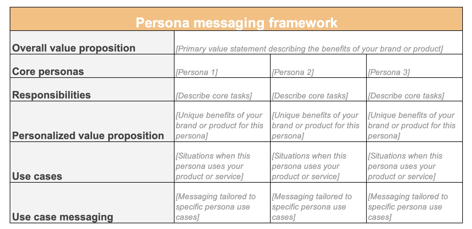This messaging map combines brand messaging, persona messaging, and product messaging — it is a great way to evaluate messages alongside one another. It is especially useful if you market multiple products.