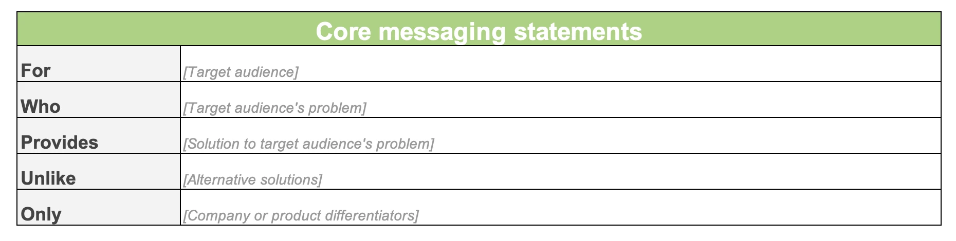 Use this simple template to define core marketing messages — the statements that will become your tagline or messaging pillars. Think of these messages as the building blocks that support all of your marketing efforts.