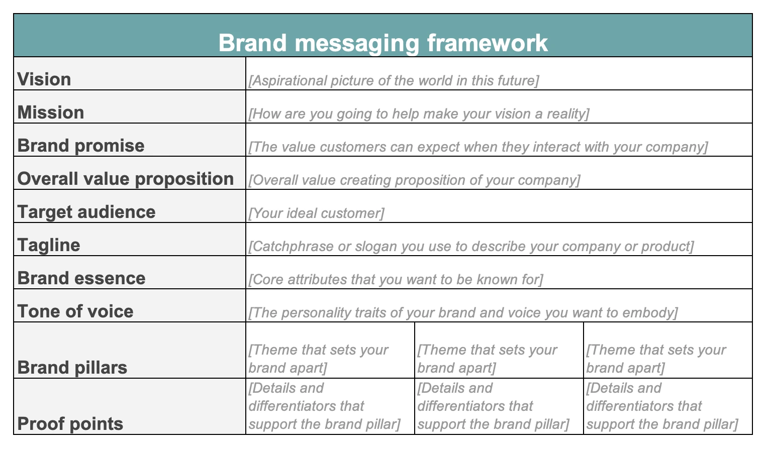 Messaging frameworks follow a top-down hierarchy. Start with the value statement that describes how your brand or product is unique, develop messaging pillars that support the value statement, and add proof points to support those pillars.