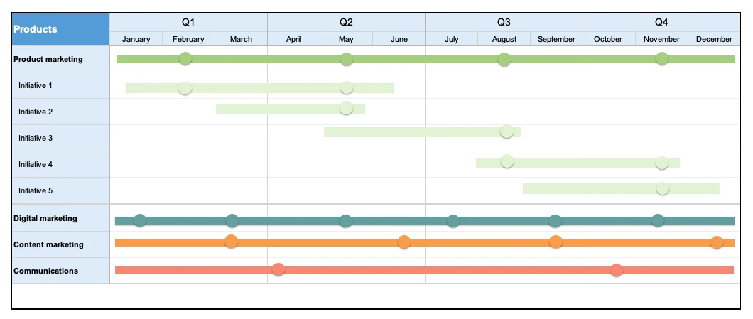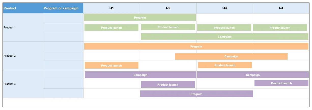 This roadmap template is useful if your marketing team supports multiple products. You can show the product team how marketing efforts are propelling the business forward. It also aligns everyone around the timing of key product releases so you can maximize promotional opportunities.