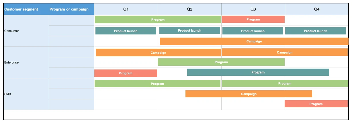 This marketing roadmap shows how planned programs, campaigns, and product launches relate to customer segments. Use this template to show executive leaders how your marketing efforts support the growth of target sets of customers. The bars are colored by marketing function so you can see which team is responsible for delivering each effort.