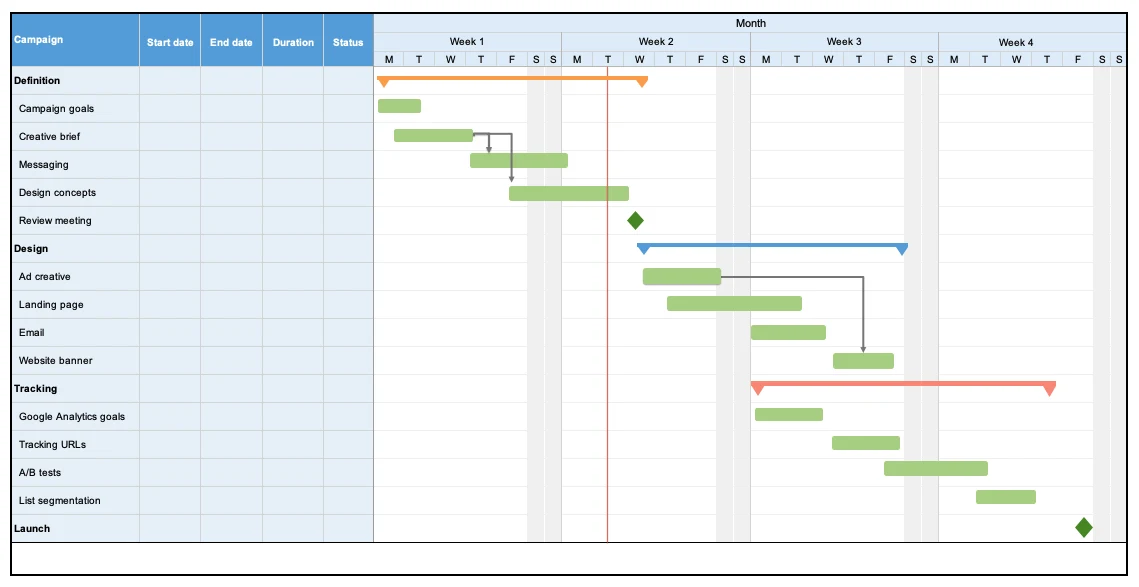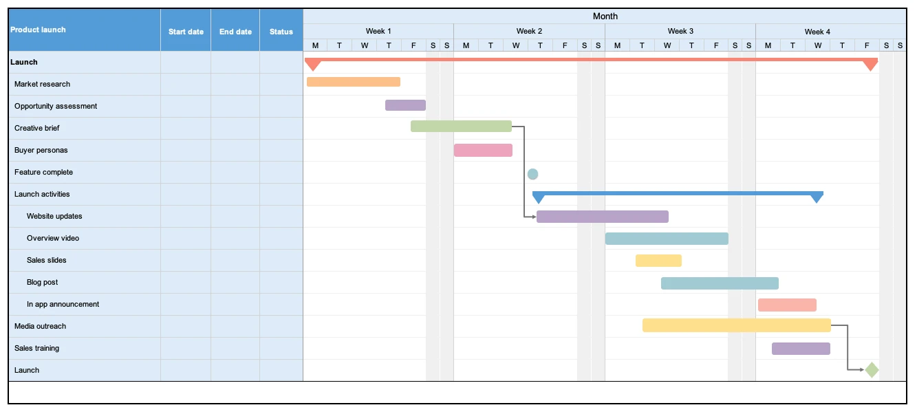 Gantt charts help marketing teams plan and manage complex projects — such as product launches and campaigns. You can highlight the key phases of your launch process and schedule tasks so they are completed on time. You can also identify and track dependencies.