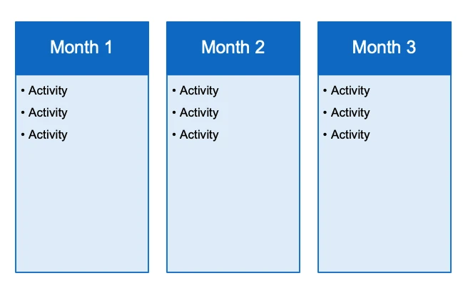 Show the marketing activities that will be completed each month to deliver your plans. |