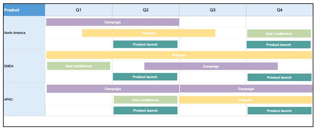 Build a roadmap to visualize your marketing efforts by geographical region. This is a useful way to visualize marketing activities in the regions or countries where your company has a presence. Capturing this information in a single view keeps local teams aligned with the overall strategy.