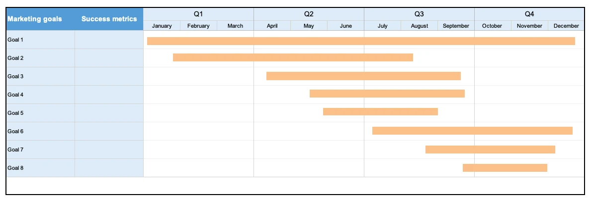 Define a set of specific and measurable marketing goals and show the timeline for achieving them. | |