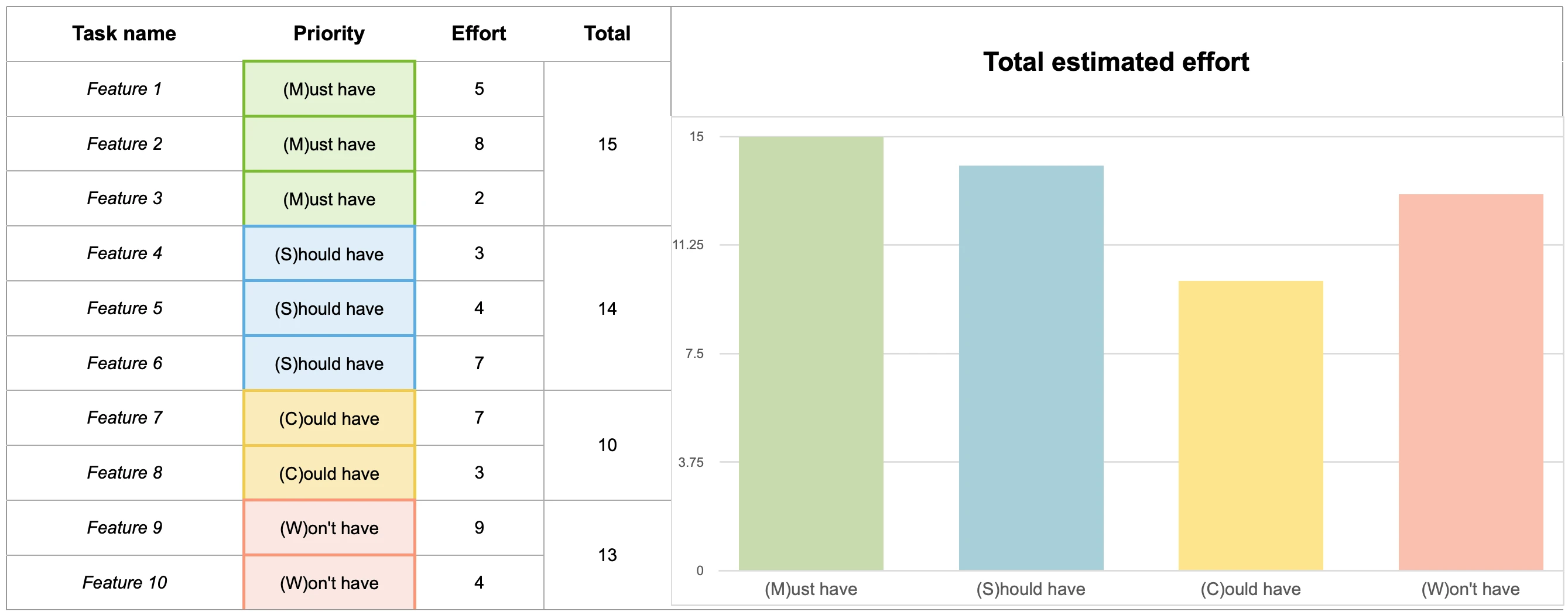 The MoSCoW framework focuses on reaching consensus by sorting features into Must haves, Should haves, Could haves, and Won't haves. The goal is to deliver incremental value across each of the categories. Use either of the two templates below that visualize the MoSCoW method.