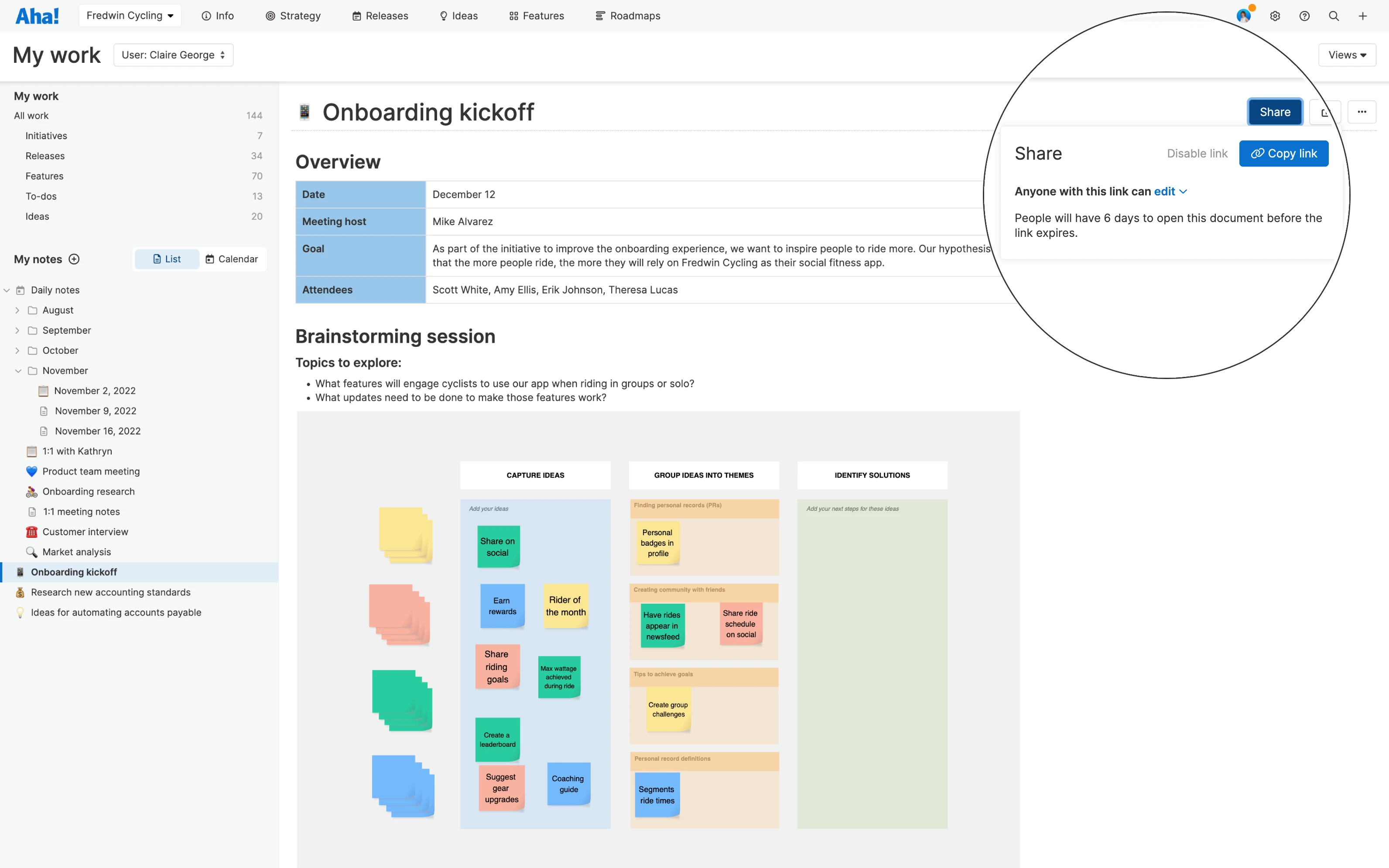 Here is the part that likely matters most to you though. As part of this launch, we made it possible for existing Aha! users to share personal notes and whiteboards with people outside of your account — so you can gather input from colleagues, contractors, customers, and partners. Simply share a link so folks can access your document in their own Aha! Create account. (They will need to agree that they want access to the document and a free Aha! Create account will be automatically created for them.) Then work together to refine concepts and collaborate on the details.