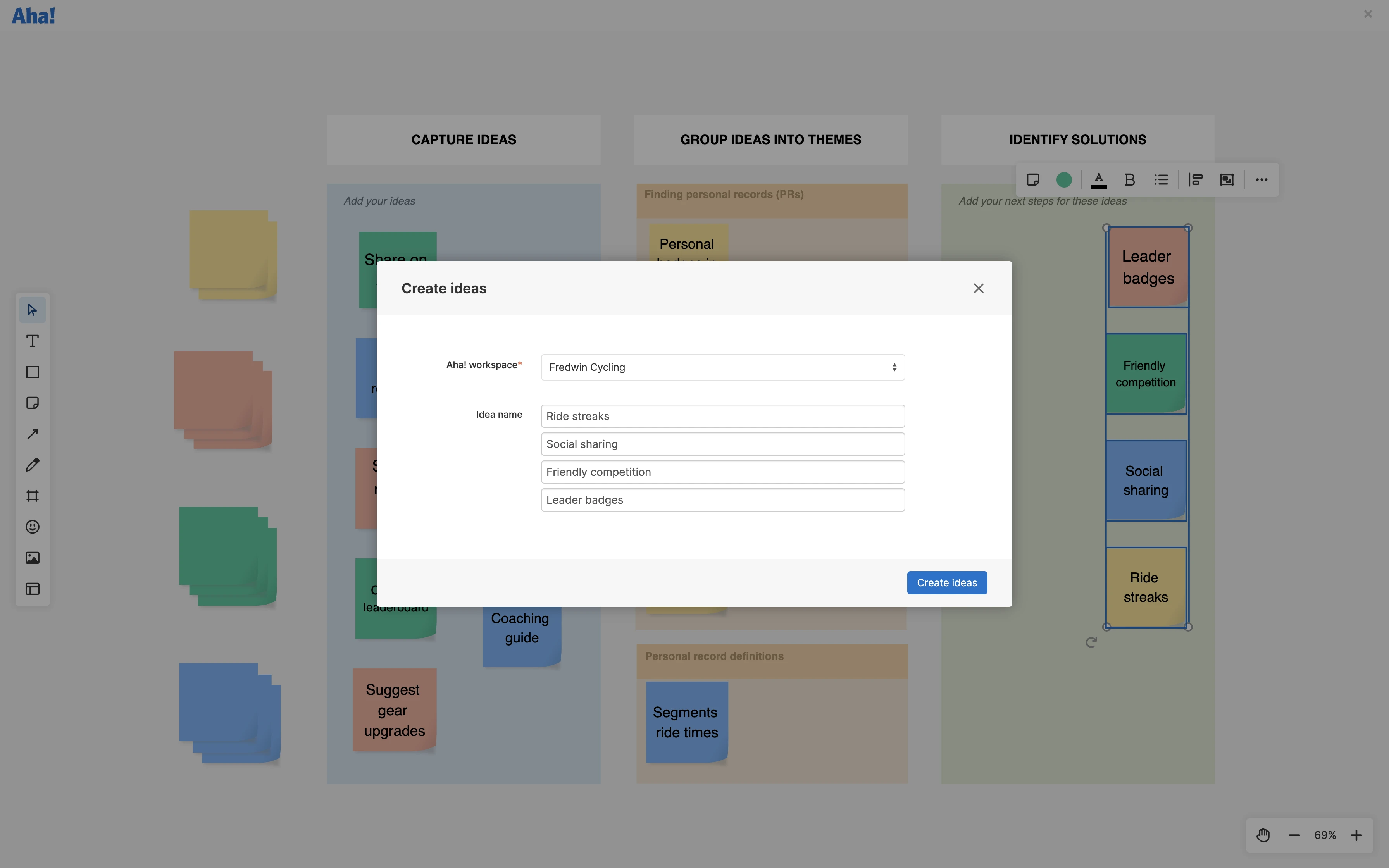 Bring the best concepts to life. When you are ready to go from ideation to implementation, select nearly any element on a whiteboard and convert into an idea record in Aha! Roadmaps. This way, you can seamlessly incorporate creative thinking in your strategic planning process — ensuring that valuable concepts never get lost.